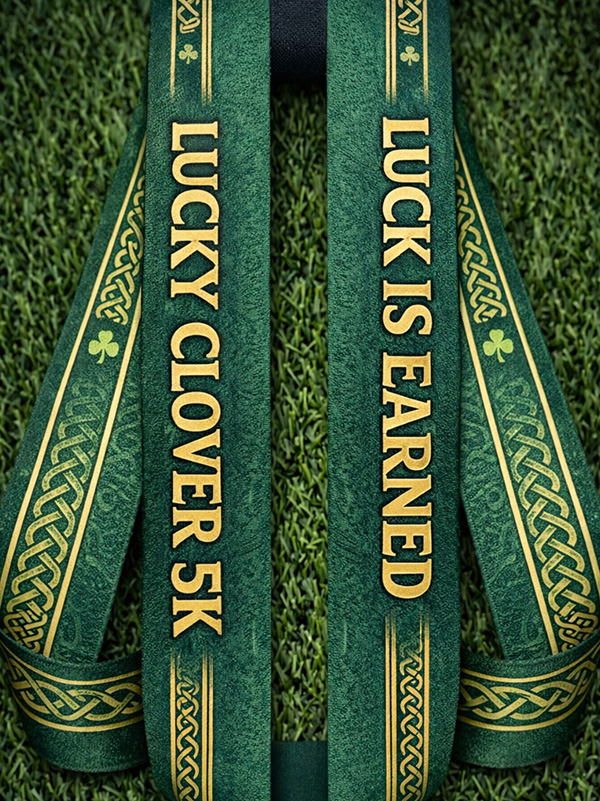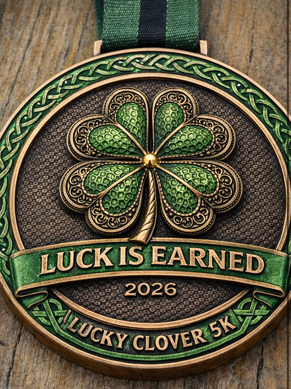 The 2026 Lucky Clover 5K finisher medal is one of our boldest and heaviest yet, featuring an intricate Celtic-inspired design and a striking four-leaf clover front and center. Finished in rich green and gold tones, it proudly declares what every finisher knows to be true:
